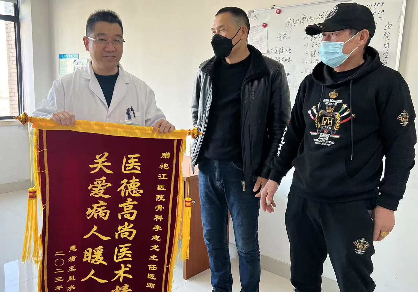 點擊藍字關注我們近日,康復出院的王某家屬將一面“醫(yī)德高尚醫(yī)術精、關愛病人暖人心”的錦旗送到紹興袍江醫(yī)院骨科,感謝李志龍主任對病人的精心治療和護理。78歲的王大媽,因摔傷致右髖部“股骨頸骨折”收治入院,同時伴有高血壓、腦梗后遺癥病、阿茲海默癥等疾病。根據患者的病史、體征及輔助檢查,診斷為“右股骨頸骨折”,結合各位專家醫(yī)生意見,在我院進行了在椎管內麻醉下“右側人工股骨頭置換術”。術后,醫(yī)護人員們常常與王大媽聊天解悶,并鼓勵她積極進行康復鍛煉。在大家的精心照顧下,王大媽最終康復出院2023-04-24