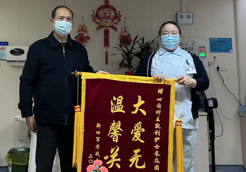 點擊藍字關注我們近日,我院內科一病區(qū)收到了這樣一面特殊的錦旗,患者的家屬將一面印有“大愛無疆溫馨關懷”的錦旗送到了內科一護士長王凱利手中,對全體醫(yī)護人員精湛的技術,無微不至的關心和照護表示由衷感謝!優(yōu)質服務暖人心患者感恩送錦旗據悉,95歲高齡的新四軍戰(zhàn)士俞爺爺因“冠狀動脈粥樣硬化性心臟病”入院,既往有“冠心病、腎功能不全、前列腺增生、痛風、慢性胃炎、腸道菌群失調”病史,有“起搏器植入術”史。由于俞爺爺是高齡患者,基礎疾病較多,科室的護理團隊對俞爺爺也是關愛有加,每天早上查房時2023-05-13