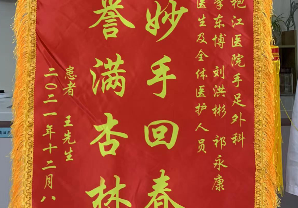 火紅的錦旗溫暖了整個(gè)冬天。對于醫(yī)務(wù)人員來說,錦旗類似于戎馬倥傯的軍人璀璨奪目的勛章,是對其認(rèn)真付出的肯定與認(rèn)可,患者把對醫(yī)護(hù)人員衷心的感謝化作錦旗上無聲的字符。12月5日上午,手足外科病區(qū)醫(yī)護(hù)人員收到來自康復(fù)患者王先生送來的錦旗,上書“妙手回春,譽(yù)滿杏林”兩行字。感謝醫(yī)護(hù)人員醫(yī)德高尚、技術(shù)過硬,服務(wù)周到、工作認(rèn)真。根據(jù)患者王先生自訴:“約2小時(shí)前與人爭執(zhí)被人咬傷左環(huán)指,傷后即感傷處疼痛、傷口出血,在附近醫(yī)院簡單包扎傷口止血處理,為求進(jìn)一步治療,遂急來我院就診?!眮碓汉?,急診擬2022-01-01