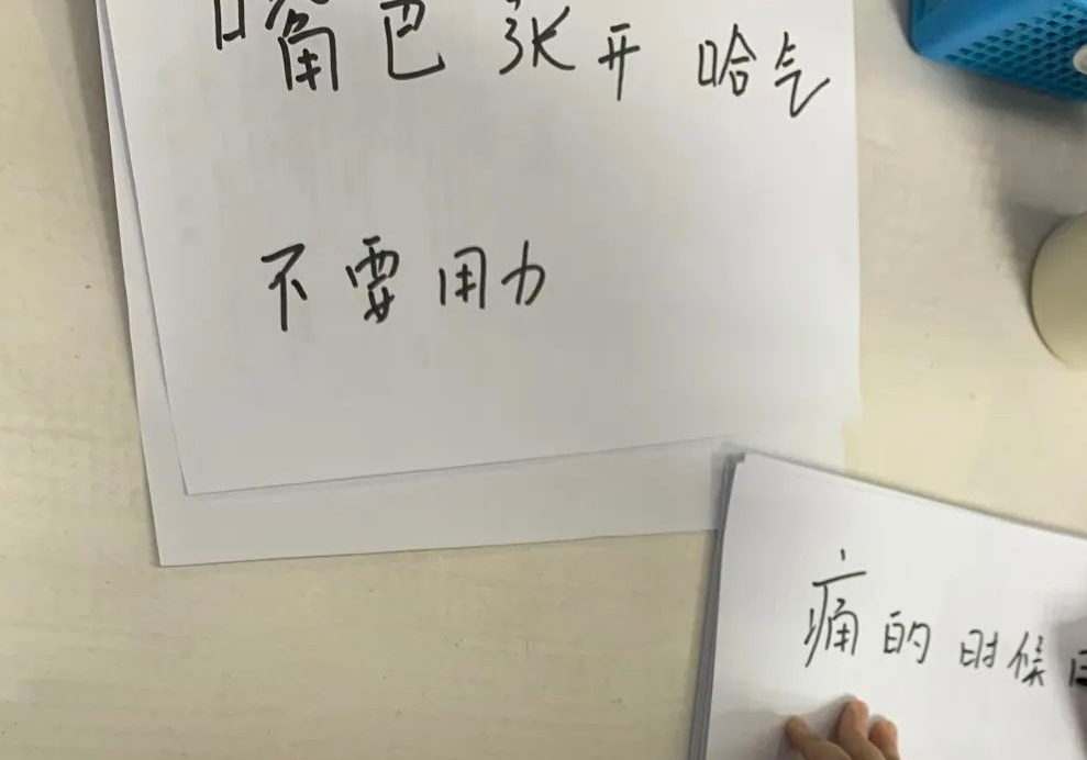 “我們科有人會手語嗎?無法問她現(xiàn)在幾分鐘痛一次。”看著眼前羊水已破并且開了三指的周女士(化名),今天的助產(chǎn)士任務(wù)格外艱巨,因?yàn)檫@位準(zhǔn)媽媽特殊的身份。周女士是一位聾啞人,所幸,了解到她認(rèn)識字后,我們立即寫字問她目前的情況,雖然速度有些慢,但需要知道的產(chǎn)婦狀況以及需要和產(chǎn)婦溝通的事情還是一步步完成了。接下來就是靜等十指開全,開始用力。在等待的時(shí)候,助產(chǎn)士已經(jīng)在腦海中模擬了可能會出現(xiàn)的情景,為這位特殊的媽媽做一些特殊的準(zhǔn)備?!靶枰焉a(chǎn)的步驟先寫在紙上,寫大一點(diǎn),到時(shí)候一張張給她看2021-12-11